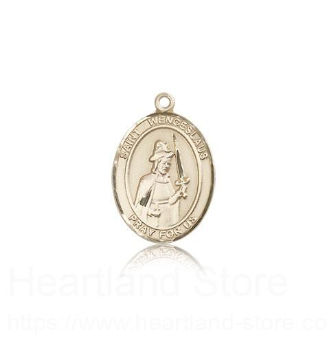 This St. Wenceslaus Pendant is made of 14 Karat Gold and is approximately the size of a nickel. The jewelry pendant is sold individually and does not come with a chain. All medals are gift boxed in a beautiful blue velvet hinged jewelry gift box.
