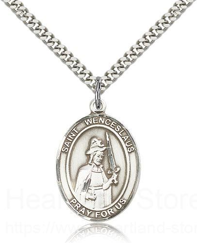 This St. Wenceslaus Pendant is made of sterling silver and is approximately the size of a quarter. The jewelry pendant is paired with a 24 inch stainless steel heavy curb chain as pictured. All medals are gift boxed in a beautiful blue velvet hinged jewelry gift box.