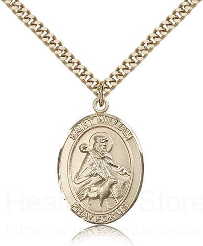 This St. William of Rochester Pendant is made of gold filled and is approximately the size of a quarter. The jewelry pendant is paired with a 24 inch gold filled heavy curb chain as pictured. All medals are gift boxed in a beautiful blue velvet hinged jewelry gift box.