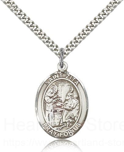 This St. Zita Pendant is made of sterling silver and is approximately the size of a quarter. The jewelry pendant is paired with a 24 inch stainless steel heavy curb chain as pictured. All medals are gift boxed in a beautiful blue velvet hinged jewelry gift box.