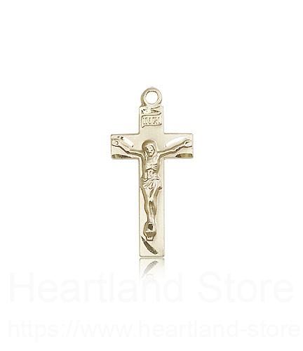 This Crucifix Pendant is made of 14 Karat Gold. The jewelry pendant is sold as pictured and does not come with a chain. All medals are gift boxed in a light blue velvet jewelry box ready for gift giving.