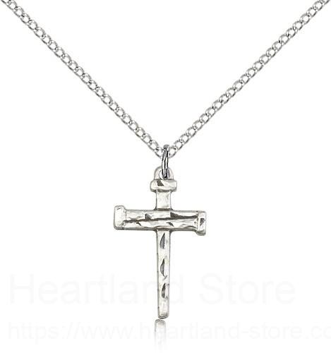 This Nail Cross Pendant is paired with an 18 inch sterling silver lite curb chain as pictured. All medals are gift boxed in a light blue velvet jewelry box ready for gift giving.