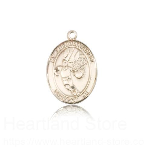 Guardian Angel Basketball Medal This Guardian Angel Basketball Pendant is made of 14 Karat Gold and is approximately the size of a nickel. The jewelry pendant is sold individually and does not come with a chain. All medals are gift boxed in a beautiful blue velvet hinged jewelry gift box.