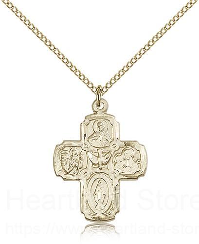 This 4 Way Cross Pendant is paired with an 18" gold filled light curb chain as pictured. All medals are gift boxed in a light blue velvet gift box ready for gift giving.