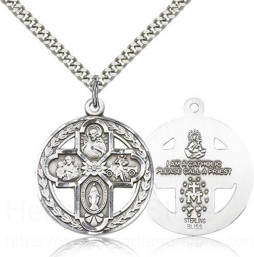 This 4 Way Cross Pendant is paired with a 24 inch stainless steel heavy curb chain as pictured. All medals are gift boxed in a light blue velvet jewelry box ready for gift giving.