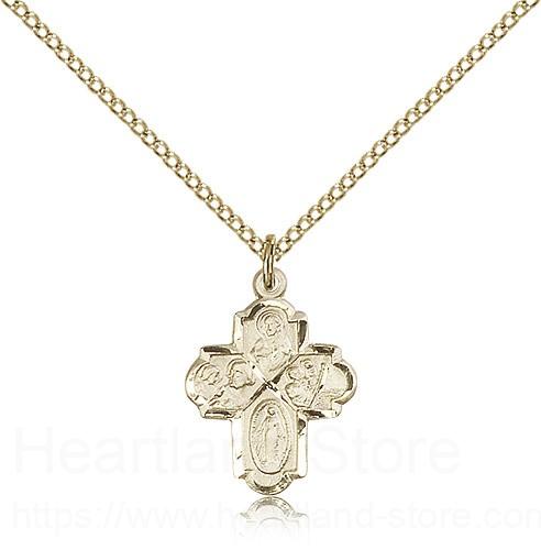 4 Way Cross Pendant is paired with an 18" gold filled light curb chain as pictured. All medals are gift boxed in a light blue velvet gift box ready for gift giving.