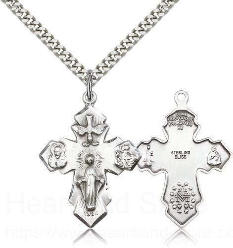 This 4 Way Cross Pendant is paired with a 24 inch stainless steel heavy curb chain as pictured. All medals are gift boxed in a light blue velvet jewelry box ready for gift giving.