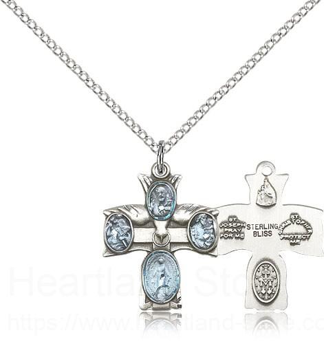 This 4 Way Cross Pendant is paired with an 18 inch sterling silver lite curb chain as pictured. All medals are gift boxed in a light blue velvet jewelry box ready for gift giving.