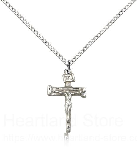 This Nail Crucifix Pendant is paired with an 18 inch sterling silver lite curb chain as pictured. All medals are gift boxed in a light blue velvet jewelry box ready for gift giving.