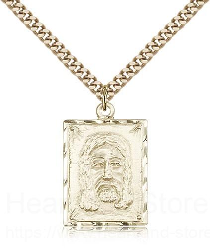 This Holy Face Medal is paired with a 24 inch stainless steel gold-tone heavy curb chain as pictured. All medals are gift boxed in a light blue velvet jewelry box ready for gift giving.