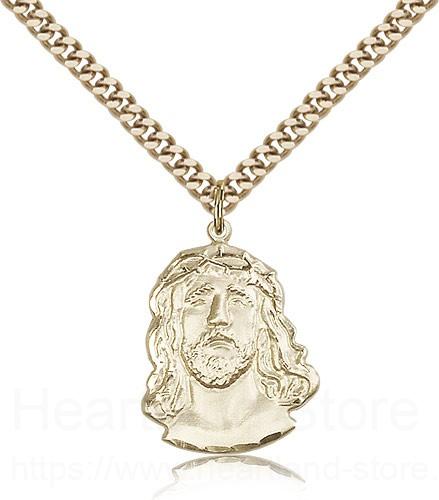 This Ecce Homo Medal is paired with a 24 inch stainless steel gold-tone heavy curb chain as pictured. All medals are gift boxed in a light blue velvet jewelry box ready for gift giving.