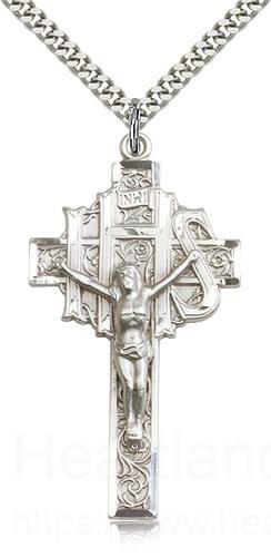 This Crucifix Pendant is paired with a 24 inch stainless steel heavy curb chain as pictured. All medals are gift boxed in a light blue velvet jewelry box ready for gift giving.