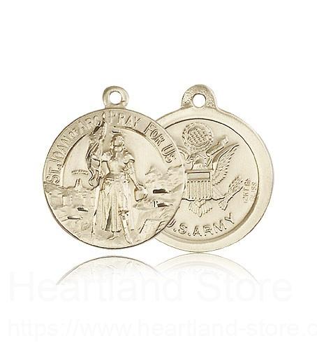 This St. Joan of Arc Army Medal is made of 14 Karat Gold. The jewelry pendant is sold as pictured and does not come with a chain. All medals are gift boxed in a light blue velvet jewelry box ready for gift giving.
