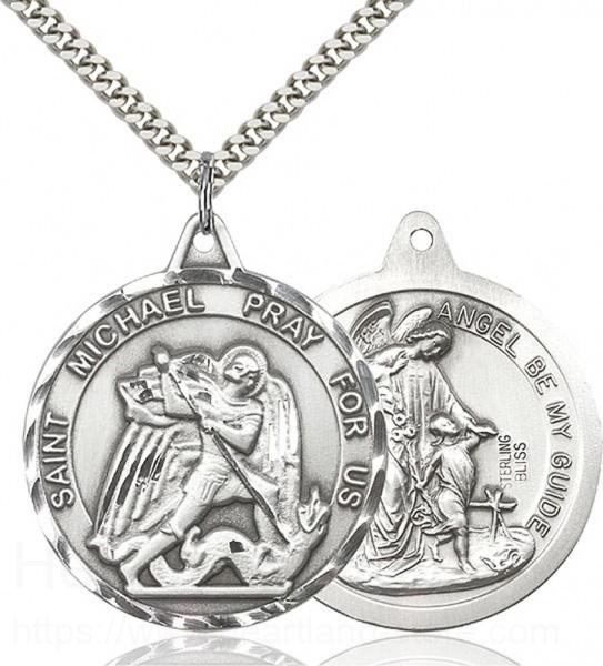 This St. Michael the Archangel Medal is paired with a 24 inch stainless steel heavy curb chain as pictured. All medals are gift boxed in a light blue velvet jewelry box ready for gift giving.