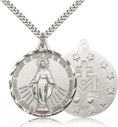 This Miraculous Medal is paired with a 24 inch stainless steel heavy curb chain as pictured. All medals are gift boxed in a light blue velvet jewelry box ready for gift giving.