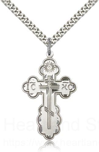 This St. Olga Cross Pendant is paired with a 24 inch stainless steel heavy curb chain as pictured. All medals are gift boxed in a light blue velvet jewelry box ready for gift giving.
