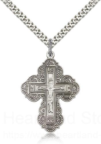 This Irene Cross Pendant is paired with a 24 inch stainless steel heavy curb chain as pictured. All medals are gift boxed in a light blue velvet jewelry box ready for gift giving.