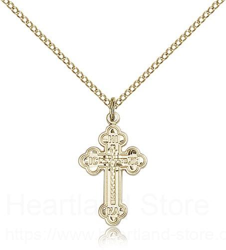 This Russian Cross Pendant is paired with an 18" gold filled light curb chain as pictured. All medals are gift boxed in a light blue velvet gift box ready for gift giving.