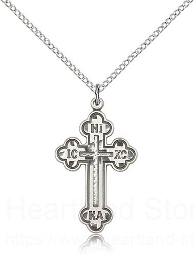 This Russian Cross Pendant is paired with an 18 inch sterling silver lite curb chain as pictured. All medals are gift boxed in a light blue velvet jewelry box ready for gift giving.