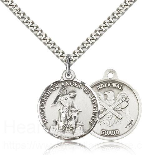 This Guardain Angel National Guard Medal is paired with a 24 inch stainless steel heavy curb chain as pictured. All medals are gift boxed in a light blue velvet jewelry box ready for gift giving.