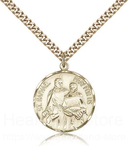 This St. Raphael Medal is paired with a 24 inch stainless steel gold-tone heavy curb chain as pictured. All medals are gift boxed in a light blue velvet jewelry box ready for gift giving.
