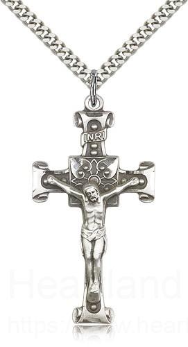This Crucifix Pendant is paired with a 24 inch stainless steel heavy curb chain as pictured. All medals are gift boxed in a light blue velvet jewelry box ready for gift giving.