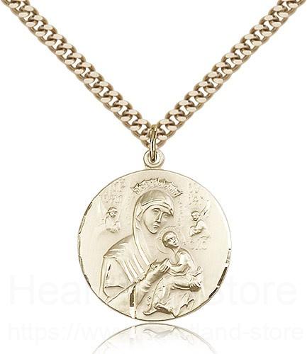 This Our Lady of Perpetual Help Medal is paired with a 24 inch stainless steel gold-tone heavy curb chain as pictured. All medals are gift boxed in a light blue velvet jewelry box ready for gift giving.