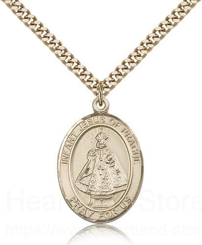 This Infant of Prague Pendant is made of gold filled and is approximately the size of a quarter. The jewelry pendant is paired with a 24 inch gold filled heavy curb chain as pictured. All medals are gift boxed in a beautiful blue velvet hinged jewelry gift box.