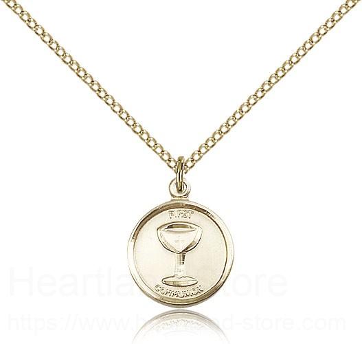 This Communion Medal is paired with an 18" gold filled light curb chain as pictured. All medals are gift boxed in a light blue velvet gift box ready for gift giving.