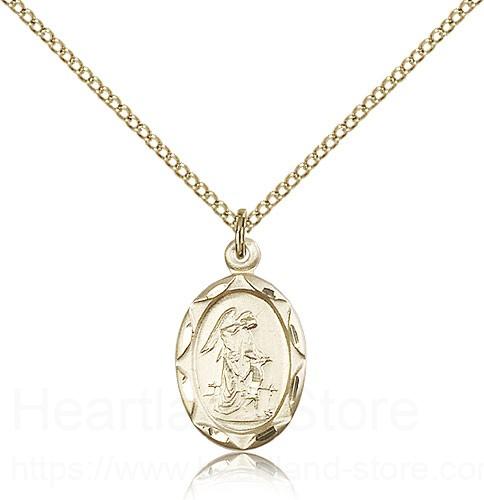 This Guardian Angel Medal is paired with an 18" gold filled light curb chain as pictured. All medals are gift boxed in a light blue velvet gift box ready for gift giving.