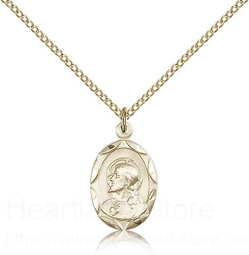 This Scapular Medal is paired with an 18" gold filled light curb chain as pictured. All medals are gift boxed in a light blue velvet gift box ready for gift giving.