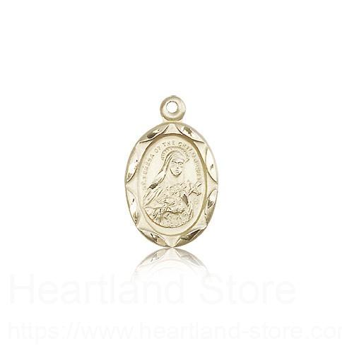 This St. Theresa Medal is made of 14 Karat Gold. The jewelry pendant is sold as pictured and does not come with a chain. All medals are gift boxed in a light blue velvet jewelry box ready for gift giving.