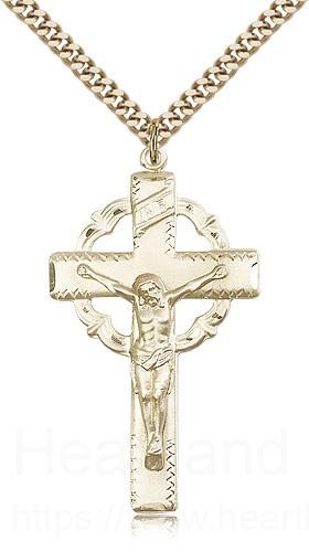 This Crucifix Pendant is paired with a 24 inch stainless steel gold-tone heavy curb chain as pictured. All medals are gift boxed in a light blue velvet jewelry box ready for gift giving.