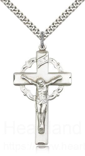This Crucifix Pendant is paired with a 24 inch stainless steel heavy curb chain as pictured. All medals are gift boxed in a light blue velvet jewelry box ready for gift giving.