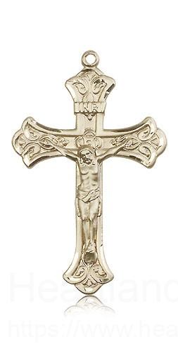 This Crucifix Pendant is made of 14 Karat Gold. The jewelry pendant is sold as pictured and does not come with a chain. All medals are gift boxed in a light blue velvet jewelry box ready for gift giving.