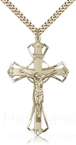 This Crucifix Pendant is paired with a 24 inch stainless steel gold-tone heavy curb chain as pictured. All medals are gift boxed in a light blue velvet jewelry box ready for gift giving.