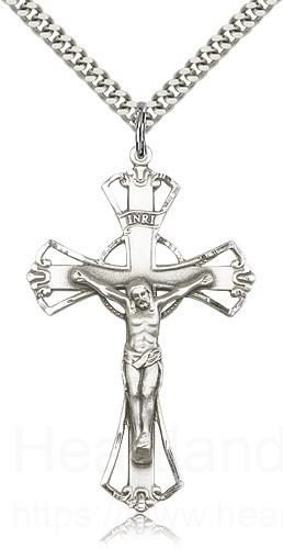 This Crucifix Pendant is paired with a 24 inch stainless steel heavy curb chain as pictured. All medals are gift boxed in a light blue velvet jewelry box ready for gift giving.