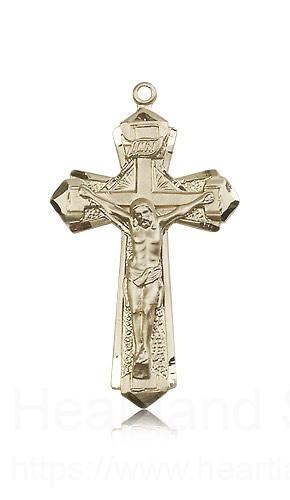This Crucifix Pendant is made of 14 Karat Gold. The jewelry pendant is sold as pictured and does not come with a chain. All medals are gift boxed in a light blue velvet jewelry box ready for gift giving.