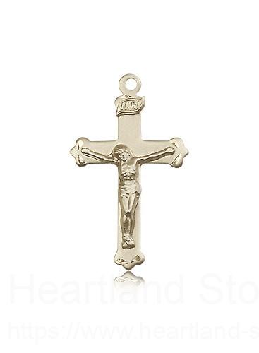 This Crucifix Pendant is made of 14 Karat Gold. The jewelry pendant is sold as pictured and does not come with a chain. All medals are gift boxed in a light blue velvet jewelry box ready for gift giving.