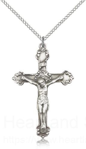 This Crucifix Pendant is paired with an 18 inch sterling silver lite curb chain as pictured. All medals are gift boxed in a light blue velvet jewelry box ready for gift giving.