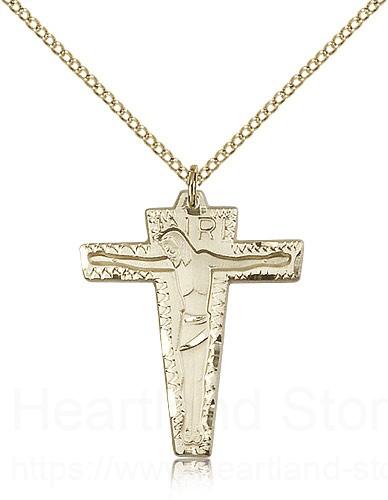 This Primative Crucifix Pendant is paired with an 18" gold filled light curb chain as pictured. All medals are gift boxed in a light blue velvet gift box ready for gift giving.