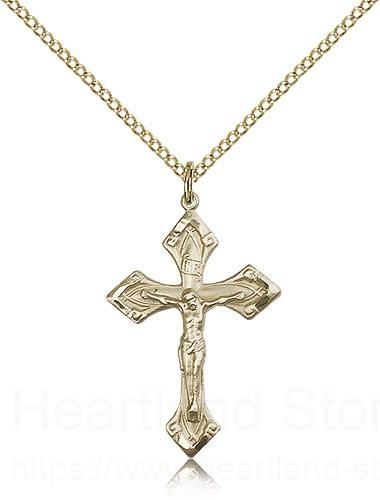 This Crucifix Pendant is paired with an 18" gold filled light curb chain as pictured. All medals are gift boxed in a light blue velvet gift box ready for gift giving.