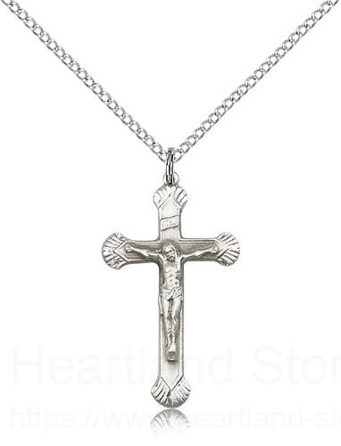 This Crucifix Pendant is paired with an 18 inch sterling silver lite curb chain as pictured. All medals are gift boxed in a light blue velvet jewelry box ready for gift giving.