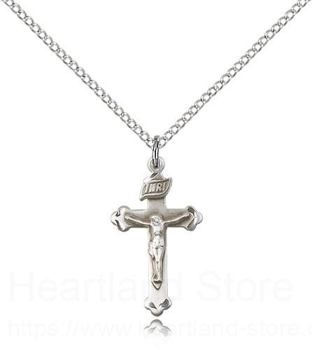 This Crucifix Pendant is paired with an 18 inch sterling silver lite curb chain as pictured. All medals are gift boxed in a light blue velvet jewelry box ready for gift giving.