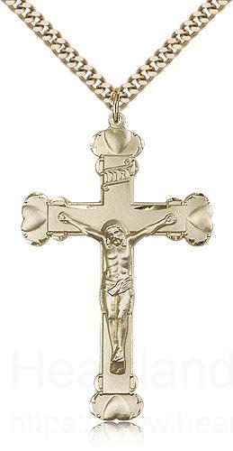 This Crucifix Pendant is paired with a 24 inch stainless steel gold-tone heavy curb chain as pictured. All medals are gift boxed in a light blue velvet jewelry box ready for gift giving.