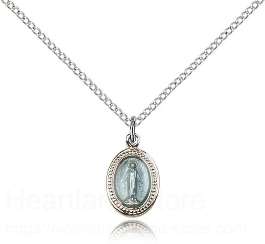 This Miraculous Medal is paired with an 18 inch sterling silver lite curb chain as pictured. All medals are gift boxed in a light blue velvet jewelry box ready for gift giving.