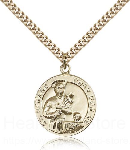 This St. Gerard Medal is paired with a 24 inch stainless steel gold-tone heavy curb chain as pictured. All medals are gift boxed in a light blue velvet jewelry box ready for gift giving.