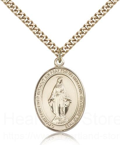 This Miraculous Pendant is made of gold filled and is approximately the size of a quarter. The jewelry pendant is paired with a 24 inch gold filled heavy curb chain as pictured. All medals are gift boxed in a beautiful blue velvet hinged jewelry gift box.