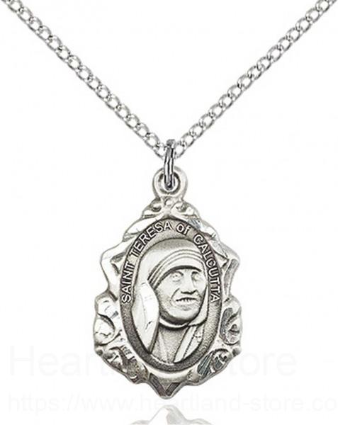 This St. Teresa of Calcutta Medal is paired with an 18 inch sterling silver lite curb chain as pictured. All medals are gift boxed in a light blue velvet jewelry box ready for gift giving.