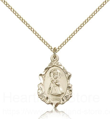 This Infant of Prague Medal is paired with an 18" gold filled light curb chain as pictured. All medals are gift boxed in a light blue velvet gift box ready for gift giving.